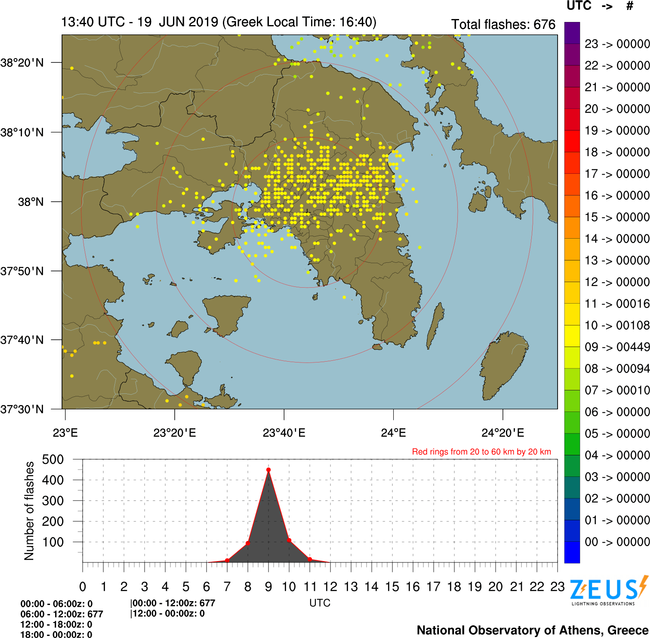 Χάρτης 2. Χωρική κατανομή των κεραυνών στην περιοχή της Αττικής, κατά τις μεσημεριανές ώρες της Τετάρτης 19/06, όπως καταγράφτηκε από το σύστημα εντοπισμού κεραυνών «ΖΕΥΣ» του Εθνικού Αστεροσκοπείου Αθηνών / Meteo.gr.