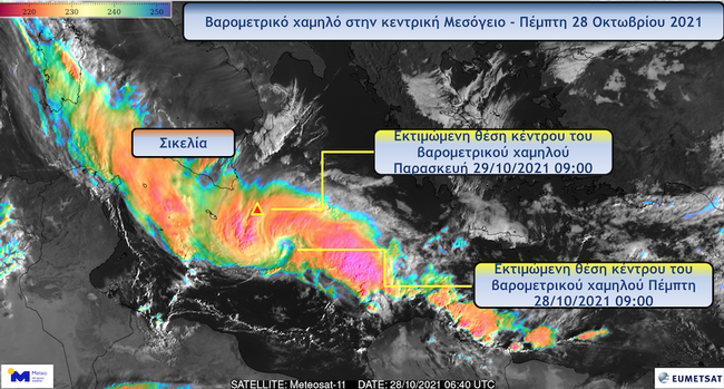Δορυφορική εικόνα του βαρομετρικού χαμηλού στην κεντρική Μεσόγειο – Πέμπτη 28/10/21
