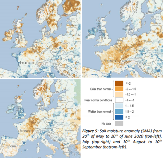Για τρίτη συνεχόμενη χρονιά, απροσδόκητα ξηρές συνθήκες επηρεάζουν την Κεντρική Ευρώπη. Μετά την ξηρά περίοδο της άνοιξης του 2020 σε όλη την Κεντρική και Δυτική Ευρώπη, ο Ιούλιος ήταν πολύ πιο ξηρός από το συνηθισμένο στη Γαλλία, το Βέλγιο και τη νότια Γερμανία. Σε συνδυασμό με το σύνολο των βροχοπτώσεων της άνοιξης, τα σχετικά ελλείμματα υετού και η υγρασία του εδάφους παραμένουν στην βορειοανατολική Γαλλία και στη βόρειας Γερμανίας. Από τον Αύγουστο, η κεντρική Σκανδιναβία και η Ισλανδία παρουσιάζει επίσης ξηρές συνθήκες.
