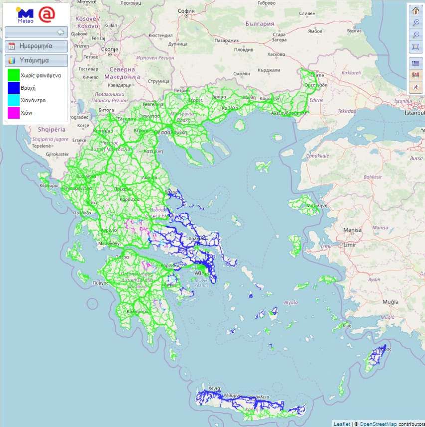 Στο χάρτη που ακολουθεί παρουσιάζονται οι καιρικές συνθήκες που θα επικρατούν στο οδικό δίκτυο της χώρας κατά το μεσημέρι της Τετάρτης 13/03 με βάση τη νέα υπηρεσία ROADS του Εθνικού Αστεροσκοπείου Αθηνών / meteo.gr. Όπως γίνεται εμφανές, πιθανά μικροπροβλήματα ή δυσκολία στην οδήγηση θα υπάρχουν μόνο στο οδικό δίκτυο της Ανατολικής Στερεάς, του Νοτίου Αιγαίου και της Κρήτης, όπου αναμένονται βροχοπτώσεις.