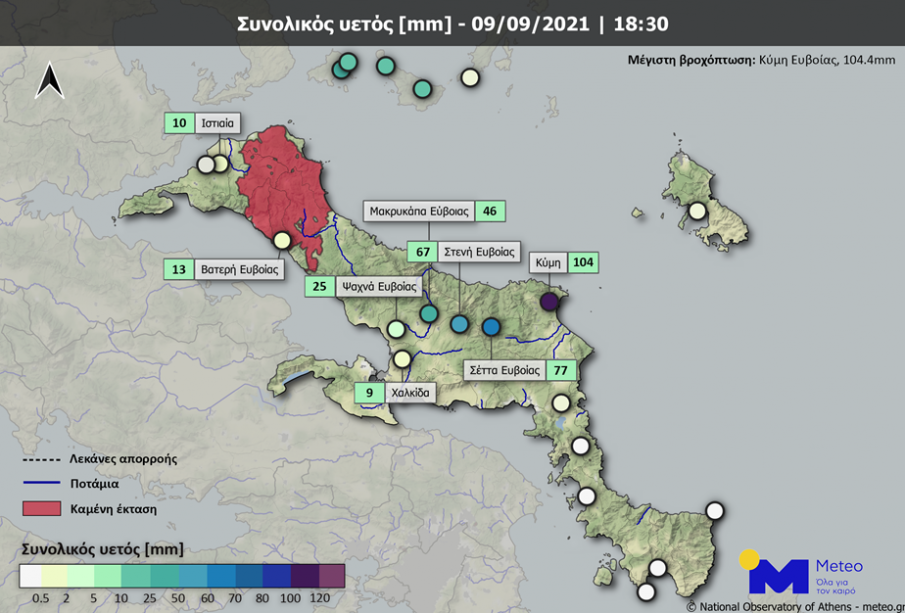 Σύμφωνα με το δίκτυο αυτόματων μετεωρολογικών σταθμών του ΕΑΑ/meteo.gr οι σημαντικότερες βροχοπτώσεις έως τις 18:30 το απόγευμα της Πέμπτης 9 Σεπτεμβρίου έχουν εκδηλωθεί στην Εύβοια, με τις μεγαλύτερες τιμές να καταγράφονται στα κεντρικά της τμήματα. Στο χάρτη που ακολουθεί με κόκκινο αποτυπώνεται η καμένη έκταση από τις μεγάλες πυρκαγιές του Αυγούστου, ενώ επισημαίνονται οι θέσεις των μετεωρολογικών σταθμών και τα ύψη βροχόπτωσης που έχουν καταγράψει.