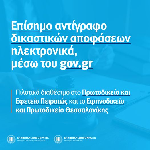 Σε πιλοτική λειτουργία τέθηκε, μέσω της Ενιαίας Ψηφιακής Πύλης (gov.gr), η εφαρμογή για την ψηφιακή αίτηση και παραλαβή επίσημου ηλεκτρονικού αντιγράφου δικαστικών αποφάσεων από το Πρωτοδικείο και Εφετείο Πειραιώς και το Ειρηνοδικείο και Πρωτοδικείο Θεσσαλονίκης. Η εφαρμογή θα επεκταθεί στο επόμενο χρονικό διάστημα και στα υπόλοιπα δικαστικά καταστήματα της χώρας.