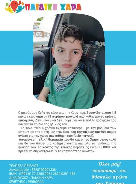 Ο Χρήστος τώρα μας χρειάζεται περισσότερο από ποτέ. Πρέπει να βοηθήσουμε να μαζευτεί το ποσό των 95.000€ για την τελική του θεραπεία στην Αγία Πετρούπολη!!! Καταθέτουμε το οποιοδήποτε ποσό μπορούμε και όλοι ΜΑΖΙ πάλι θα τα καταφέρουμε. ♥️ΤΡΑΠΕΖΑ ΠΕΙΡΑΙΩΣ Λογαριασμός : 5228100291338IBAN : GR04 0172 2280 0052 2810 0291 338ΔΙΚΑΙΟΥΧΟΣ : ΠΑΙΔΙΚΗ ΧΑΡΑ SWIFT/BIC : PIRBGRAAΠοια είναι η ιστορία του Χρήστου : https://m.facebook.com/story.php?story_fbid=604743430234591&id=256836328358638