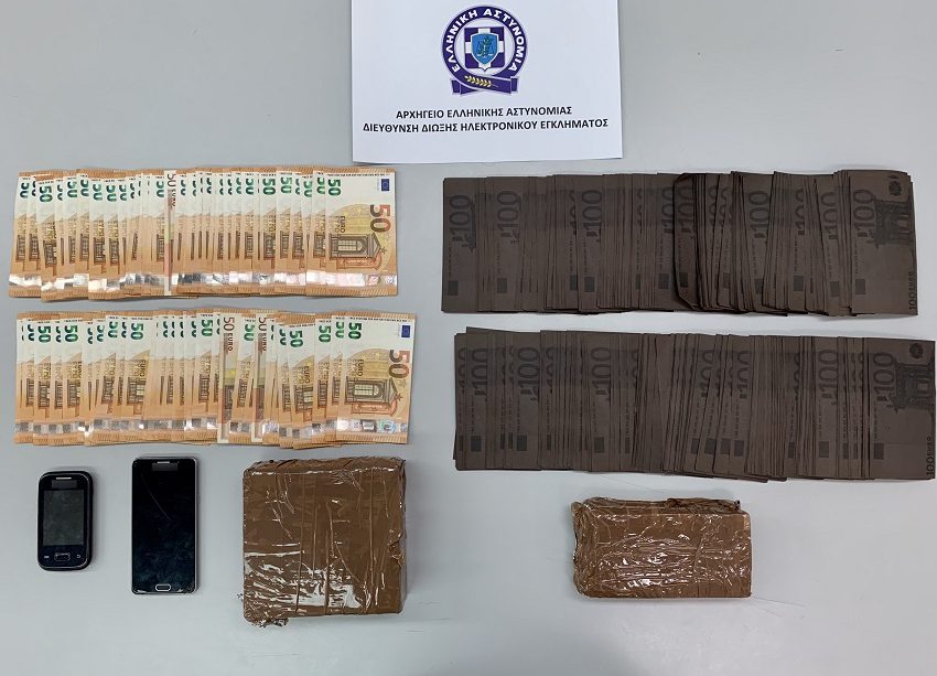 Από τις έρευνες που ακολούθησαν συνολικά βρέθηκαν και κατασχέθηκαν (3.450) ευρώ, πλήθος τεμάχια μαύρου χαρτιού με εντυπώσεις στοιχείων και διαστάσεις χαρτονομισμάτων των (100) ευρώ και (2) κινητά τηλέφωνα.
