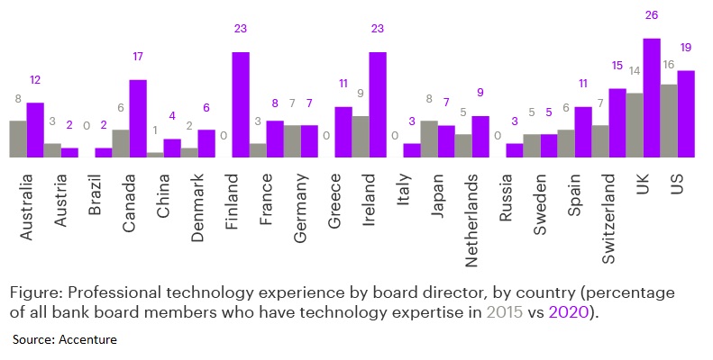 Στο πλαίσιο της μελέτης, η Accenture προτείνει ότι 25% των στελεχών των διοικητικών συμβουλίων των τραπεζών θα πρέπει να έχουν τεχνολογική εμπειρία. Παρόλο που οι μεγαλύτερες τράπεζες σε παγκόσμιο επίπεδο έχουν σημειώσει πρόοδο στην τοποθέτηση στελεχών με τεχνολογική εμπειρία στα διοικητικά συμβούλιά τους -τα οποία η Accenture ορίζει ως στελέχη που κατέχουν ή κατείχαν ανώτερες τεχνολογικές θέσεις σε έναν οργανισμό ή ρόλο ευθύνης σε εταιρεία τεχνολογίας- η πρόοδος αυτή είναι αργή.