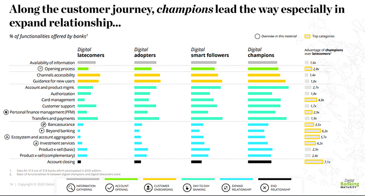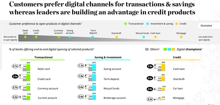 Παγκοσμίως, ωστόσο, μόλις μία στις δέκα τράπεζες (περίπου το 10%) χαρακτηρίζονται digital champions. Οι ψηφιακοί πρωταθλητές χρησιμοποιούν πρωτοπόρες πρακτικές και δημιουργούν τις ψηφιακές τάσεις στον κλάδο.