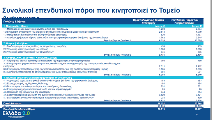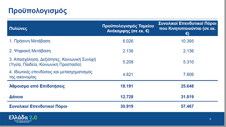 Τα 170 έργα και μεταρρυθμίσεις του Εθνικού Σχεδίου Ανάκαμψης βασίζονται σε τέσσερις πυλώνες: ψηφιακός μετασχηματισμός, πράσινη ανάπτυξη, επενδύσεις και νέο κοινωνικό μοντέλο. Από τα €17,8 δισ. των επιδοτήσεων στην Ψηφιακή Μετάβαση θα κατευθυνθούν €2,136 δισ., στην Πράσινη Μετάβαση €6,026 δισ., στην Απασχόληση και τις Δεξιότητες €5,208 δισ., ενώ οι ιδιωτικές επενδύσεις και ο μετασχηματισμός της οικονομίας θα απορροφήσουν €4,821 δισ.