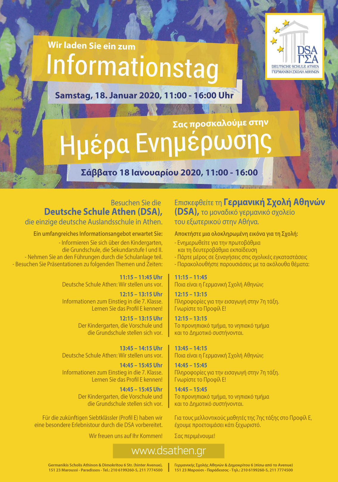 Η Γερμανική Σχολή Αθηνών (DSA), το μοναδικό «Γερμανικό Σχολείο του Εξωτερικού» στην Αθήνα, προσκαλεί όλους τους ενδιαφερόμενους το Σάββατο 18 Ιανουαρίου 2020 από τις 11:00 έως τις 16:00 στη φετινή Ημέρα Ενημέρωσης. Επισκεφθείτε τις σύγχρονες εγκαταστάσεις της DSA στο Μαρούσι και ενημερωθείτε για το εκπαιδευτικό πρόγραμμα και τα πλεονεκτήματα φοίτησης του παιδιού σας σε ένα από τα παλαιότερα και πιο επιτυχημένα ξενόγλωσσα σχολεία της Ελλάδας.