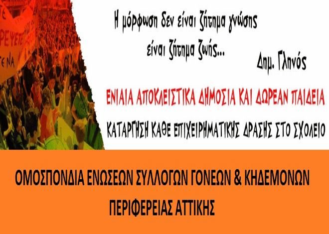 Η Ομοσπονδία Γονέων Αττικής απευθύνει κάλεσμα σε όλες τις Ενώσεις και Συλλόγους Γονέων της Περιφέρειάς μας, για δυνάμωμα της πάλης μας έτσι ώστε να μην κατατεθεί το νομοσχέδιο της κυβέρνησης ΝΔ για την Παιδεία.