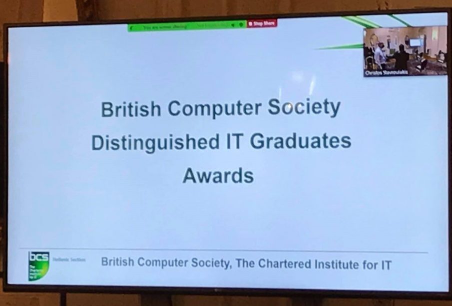 Στις 17/9/2020 πραγματοποιήθηκε η πρώτη βράβευση από το British Computer Society (BCS) στην Ελλάδα, αριστούχων αποφοίτων Πανεπιστημίων, που πρώτευσαν στις πτυχιακές και μεταπτυχιακές σπουδές τους στην Πληροφορική.