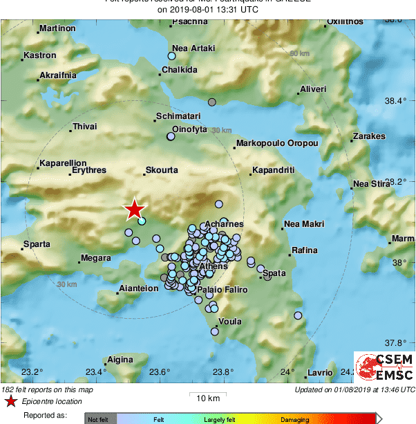 Σεισμική δόνηση μεγέθους 3.5 βαθμών της κλίμακας Ρίχτερ σημειώθηκε στις 16:31 το απόγευμα της Πέμπτης 01-08-2019. Το επίκεντρο της δόνησης είναι 23 χλμ βορειοδυτικά της Αθήνας. Το εστιακό βάθος μετρήθηκε στα 5 χλμ.