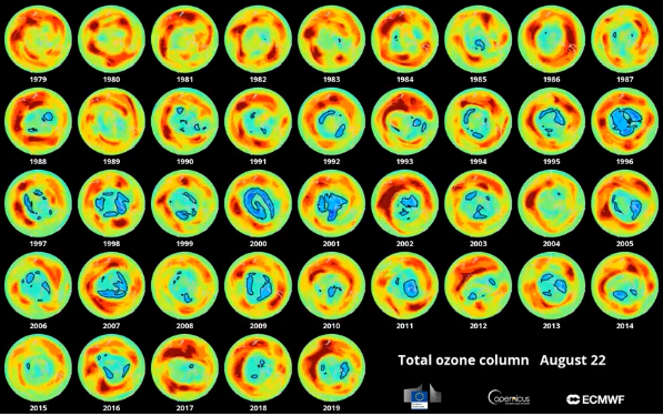 Το προστατευτικό στρώμα του όζοντος στη Στρατόσφαιρα βρίσκεται σε πορεία αποκατάστασης, εξαιτίας της σταδιακής κατάργησης των ανθρωπογενών ουσιών, που είναι επιβλαβείς για το όζον, όπως ορίζεται ρητά από το Πρωτόκολλο του Μόντρεαλ. Οι επιστήμονες ελπίζουν πως ίσως μέχρι το 2060 η έκταση του στρώματος του όζοντος μπορεί να επιστρέψει στα επίπεδα προ του 1980. Ωστόσο, η εξαιρετικά μικρή «τρύπα» του όζοντος το 2019, αποδίδεται στις ασυνήθιστες μετεωρολογικές συνθήκες: