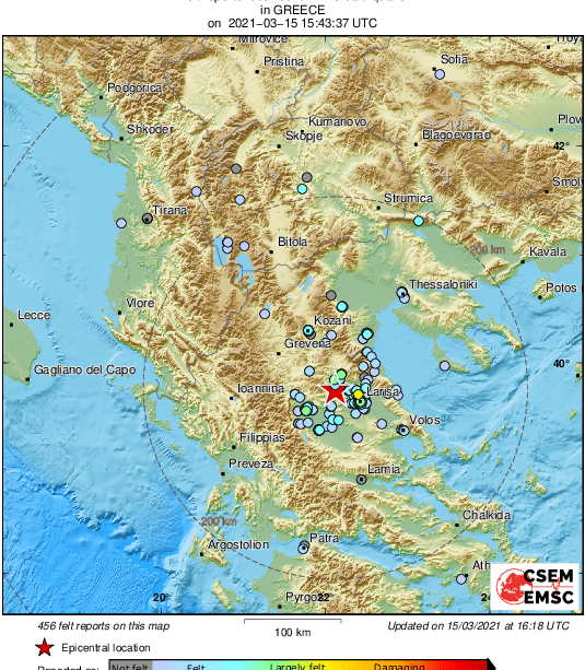 Σεισμική δόνηση μεγέθους 4.4 βαθμών της κλίμακας Ρίχτερ σημειώθηκε στις 17:43 το απόγευμα της Δευτέρας 15-03-2021. Το επίκεντρο της δόνησης είναι 16 χλμ νότια-νοτιοδυτικά της Ελασσόνας . Το εστιακό βάθος μετρήθηκε στα 6.5 χλμ.