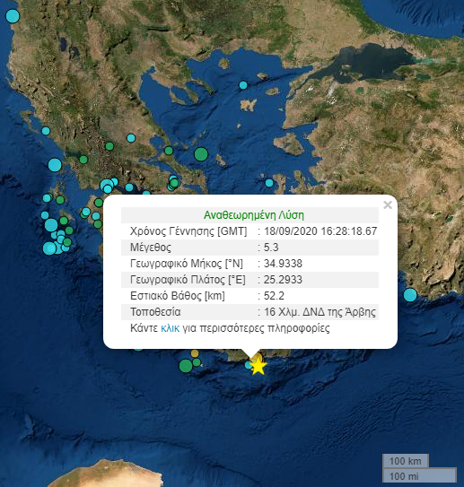 Σεισμική δόνηση μεγέθους 5.3 βαθμών της κλίμακας Ρίχτερ σημειώθηκε στις 19.28 το απόγευμα της Παρασκευής 18-09-2020. Το επίκεντρο της δόνησης είναι : 16 Χλμ. ΔΝΔ της Άρβης. Το εστιακό βάθος μετρήθηκε στα 52 χλμ.