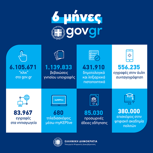 Παρατίθενται ενδεικτικά στοιχεία για τη χρήση των κυριότερων υπηρεσιών του gov.gr για τους πρώτους έξι μήνες: