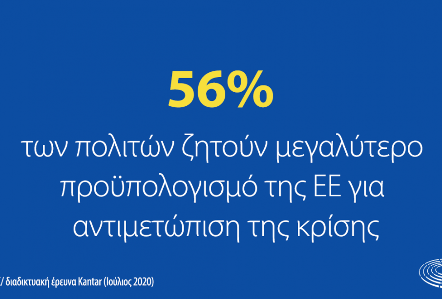 Το 56% των Ευρωπαίων πιστεύει ότι η ΕΕ πρέπει να διαθέτει ισχυρότερα οικονομικά μέσα για να αντιμετωπίσει τις επιπτώσεις της πανδημίας του κορονοϊού. Σε 15 κράτη μέλη της ΕΕ, η απόλυτη πλειοψηφία των συμμετεχόντων συμφωνεί με τη συγκεκριμένη άποψη, με επικεφαλής την Ελλάδα (79%), την Κύπρο (74 %), την Ισπανία και την Πορτογαλία (71% και στις δύο χώρες).