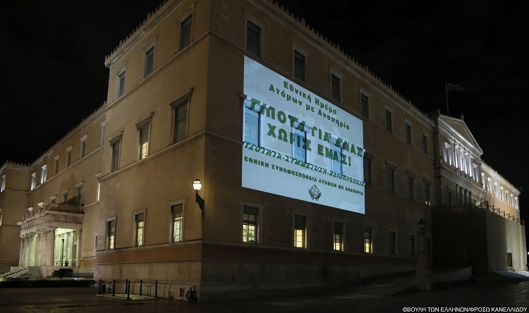 Φωταγώγηση του κτηρίου της Βουλής για την Παγκόσμια Ημέρα Ατόμων με Αναπηρία
