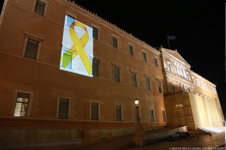 Η Βουλή φωταγωγήθηκε με τη χρυσή κορδέλα, το σύμβολο της μάχης κατά του καρκίνου στα παιδιά και τους εφήβους
