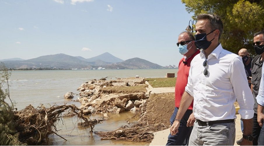 Ο Κυριάκος Μητσοτάκης πραγματοποίησε αρχικά εναέρια αυτοψία των πληγεισών περιοχών με ελικόπτερο της Πυροσβεστικής, συνοδευόμενος από τον Υπουργό Εσωτερικών Τάκη Θεοδωρικάκο, τον Υφυπουργό Προστασίας του Πολίτη Νίκο Χαρδαλιά, τον Γενικό Γραμματέα Πολιτικής Προστασίας Βασίλη Παπαγεωργίου και τον Γενικό Γραμματέα Υποδομών, Γιώργο Καραγιάννη.
