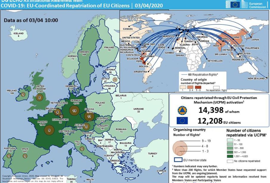 Η πανδημία του κορωνοϊού, το συνεπακόλουθο κλείσιμο των συνόρων και οι ακυρώσεις πτήσεων από χώρες εκτός ΕΕ, άφησαν χιλιάδες Ευρωπαίους πολίτες αποκλεισμένους μακριά από το σπίτι τους. Ο παρακάτω χάρτης δείχνει ότι από την αρχή της κρίσης, πάνω από 12.000 Ευρωπαίοι έχουν ήδη επαναπατριστεί, με τη συνδρομή του Ευρωπαϊκού Μηχανισμού Πολιτικής Προστασίας ο οποίος συντονίζει και χρηματοδοτεί το 75% των εξόδων.