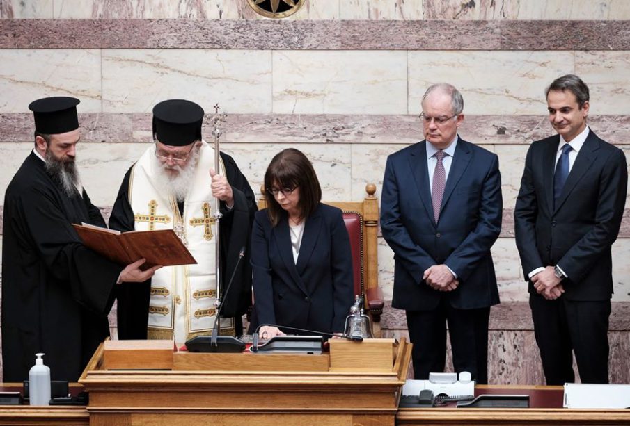 Ορκίσθηκε σήμερα ενώπιον της Ολομέλειας της Βουλής των Ελλήνων, σύμφωνα με το άρθρο 33 του Συντάγματος, η Πρόεδρος της Δημοκρατίας κύρια Κατερίνα Σακελλαροπούλου. Την Ορκωμοσία τέλεσε ο Αρχιεπίσκοπος Αθηνών και πάσης Ελλάδος κύριος Ιερώνυμος, προεξάρχων εκπροσώπων της Ιεράς Συνόδου.
