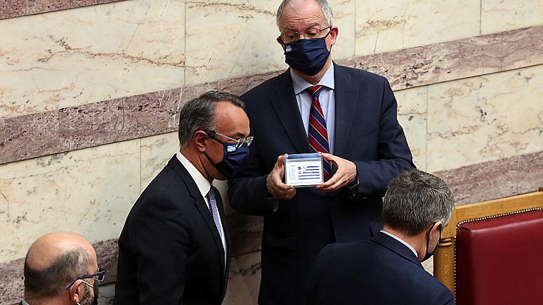 Σε ψηφιακή μορφή και μέσα σε ένα κουτάκι που έφερε την ελληνική σημαία, ο υπουργός Οικονομικών Χρήστος Σταϊκούρας κατέθεσε στην Ολομέλεια τον προϋπολογισμό του κράτους για το 2021.