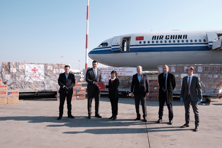 Το υγειονομικό υλικό παρέδωσε, εκ μέρους της κινεζικής κυβέρνησης, η πρεσβευτής της Κίνας στην Ελλάδα, Τσανγκ Τσιγιουέ, στους υπουργούς Επικρατείας Γιώργο Γεραπετρίτη, Υγείας Βασίλη Κικίλια, τον αναπληρωτή υπουργό Εξωτερικών Μιλτιάδη Βαρβιτσιώτη και τον γενικό γραμματέα Διεθνών Οικονομικών Σχέσεων και Εξωστρέφειας του ΥΠΕΞ Γρηγόρη Δημητριάδη. Στην ίδια πτήση, σύμφωνα με την ίδια ενημέρωση, έφθασαν και άλλα χαρτοκιβώτια ιατρικών προμηθειών, βάρους περίπου 10 τόνων, δωρεά από κινεζικές επιχειρήσεις και οργανώσεις.