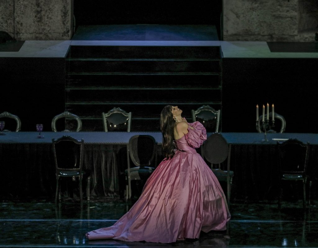 Η Τραβιάτα, παρουσιασμένη στον ιστορικό χώρο του Ηρωδείου, εντάσσεται σε μια απαιτητική όσο και ενδιαφέρουσα συνθήκη: πρέπει κανείς να βρει την ισορροπία μεταξύ των σκηνών της επιδεικτικής ευδαιμονίας και των στιγμών της ιδιωτικότητας. Οι τοίχοι του αρχαίου Ωδείου είναι εγγυητές της διαχρονίας και εντάσσουν υποχρεωτικά την αφήγηση στον μεγάλο χρόνο. Στον ενδιάμεσο αυτό χώρο, μεταξύ παρελθόντος και μέλλοντος, η Βιολέττα μοιάζει σταματημένη σε μια εποχή μετέωρη, προσφέροντας στον θεατή την ιστορία της, προϊόν κι αυτή προς κατανάλωση, όπως ήταν και η ίδια.