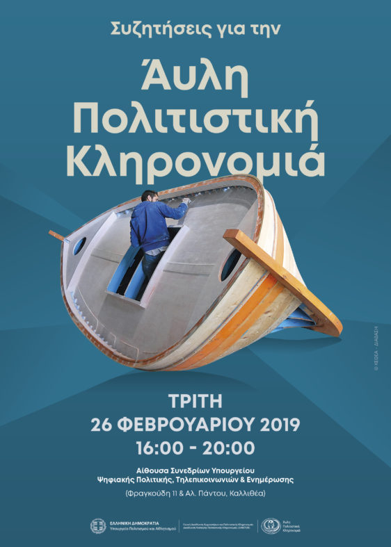 Το Υπουργείο Πολιτισμού και Αθλητισμού διοργανώνει εκδήλωση με τίτλο «Συζητήσεις για την Άυλη Πολιτιστική Κληρονομιά», η οποία θα πραγματοποιηθεί την Τρίτη 26 Φεβρουαρίου 2019, ώρα 16.00 – 20.00, στην Αίθουσα Συνεδρίων του Υπουργείου Ψηφιακής Πολιτικής, Τηλεπικοινωνιών και Ενημέρωσης (Φραγκούδη 11 & Αλ. Πάντου, Καλλιθέα).