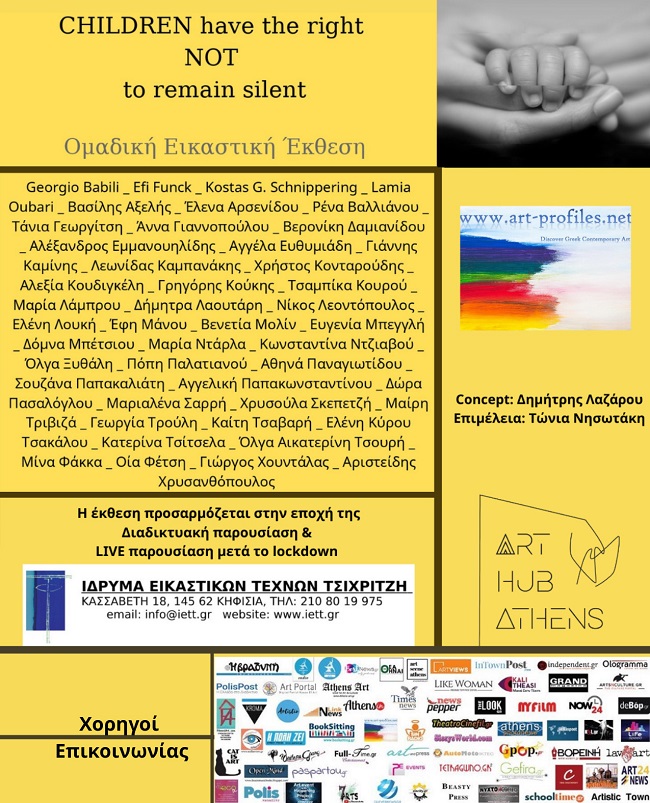 σε ημερομηνίες που θα ανακοινωθούν, μόλις το επιτρέψει η άρση των μέτρων καραντίνας την ομαδική εικαστική έκθεση με θέμα :CHILDRENhave the right NOTto remain silentΠάντα η Τέχνη γνωρίζει να προσαρμόζεται και να επιβιώνει στις ιδιαίτερες συνθήκες της κάθε εποχής.CHILDRENhavetherightNOTtoremainsilentείναι η ομαδική έκθεση που αποδεικνύει την προσαρμοστικότητα της Τέχνης σε κάθε συνθήκη, αναδεικνύοντας τα παγκόσμια και αναφαίρετα δικαιώματα των παιδιών μέσα από τα έργα 45 σύγχρονων εικαστικών.