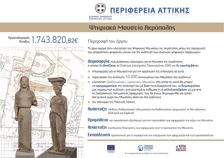 Με τη στήριξη της Περιφέρειας Αττικής και αξιοποιώντας τους πόρους του ΕΣΠΑ 2014-2020, ολοκληρώθηκε η δημιουργία του Ψηφιακού Μουσείου της Ακρόπολης. Ειδικότερα, το έργο «Δημιουργία Ψηφιακού Μουσείου Ακρόπολης», το οποίο χρηματοδοτήθηκε από τον Άξονα Προτεραιότητας 2 του ΠΕΠ «Αττική 2014-2020», έχει υλοποιηθεί πλήρως και πλέον οι πολίτες μπορούν να απολαμβάνουν εξ αποστάσεως και με ασφάλεια όλα τα εκθέματα του Μουσείου της Ακρόπολης.