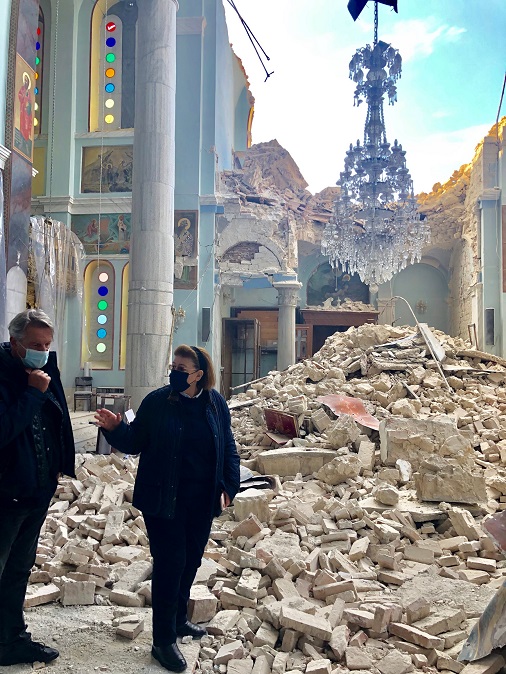 Μετά την αυτοψία η κ. Μενδώνη δήλωσε «οι ζημιές είναι αρκετές. Όμως μπορούν να αποκατασταθούν. Θα γίνει ο προγραμματισμός, ώστε τις επόμενες ημέρες να παρίσταται επί τόπου κλιμάκιο του Υπουργείου Πολιτισμού και Αθλητισμού για τις καταγραφές των ζημιών στα μνημεία. Συγχρόνως, το κλιμάκιο του Υπουργείου θα βοηθήσει την Τοπική Αυτοδιοίκηση σε μία σειρά άμεσων ενεργειών. Αυτό που επείγει είναι να υποστηλωθούν τα μνημεία για να μην υπάρξει κίνδυνος για την ανθρώπινη ζωή. Η απώλεια των δύο παιδιών μας έχει συγκλονίσει. Θα μπορούσε να είχε αποφευχθεί, αν υπήρχε μέριμνα για τα ερειπωμένα κτήρια. Στα Μουσεία Βαθέος και Πυθαγορείου δεν έχουμε προβλήματα. Αποκολλήθηκε ένα σημείο στη συγκόλληση του μεγάλου Κούρου. Αποκολλήθηκε τμήμα του γύψου. Το ίδιο το άγαλμα δεν έπαθε τίποτα. Τα γλυπτά είναι όλα στη θέση τους. Μετακινήθηκαν από τις βάσεις τους ελάχιστα αντικείμενα, αγγεία και χάλκινα. Επομένως δεν έχομε απώλειες. Σε ό,τι αφορά τις εκκλησίες που είναι μνημεία και χρήζουν προστασίας, θα πάρουμε τα άμεσα σωστικά μέτρα. Θα υποστηλωθούν, θα μπουν τυχόν περιφράξεις, για να μην υπάρχει κίνδυνος για τους πολίτες. Είναι πολλή η δουλειά που πρέπει να γίνει. Με τη βοήθεια των ειδικών θα γίνουν οι μελέτες αποκατάστασης. Χρειάζεται αρκετή δουλειά και σωστός σχεδιασμός”.