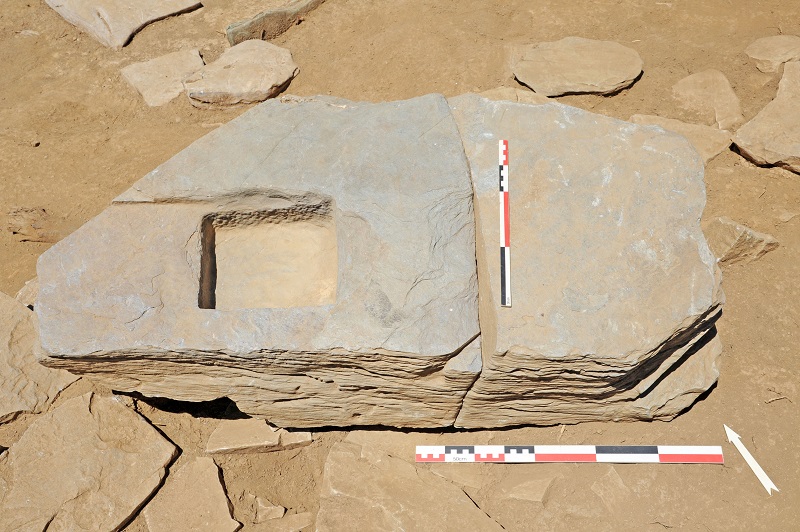 Στη νοτιοανατολική μεγαλοπρεπή είσοδο οι τομές ανέδειξαν (Φωτ.10) τις παραστάδες αλλά και αποκάλυψαν πλήρως τον δυτικό χώρο με βωμό και αποθέτη, καθώς και το δάπεδο ορόφου που διατηρήθηκε πεσμένο λοξά προς εξωτερικό χώρο (Φωτ.11).