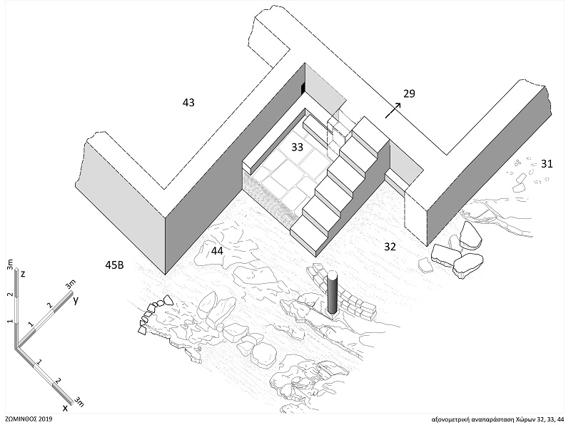 Στη νοτιοανατολική μεγαλοπρεπή είσοδο οι τομές ανέδειξαν (Φωτ.10) τις παραστάδες αλλά και αποκάλυψαν πλήρως τον δυτικό χώρο με βωμό και αποθέτη, καθώς και το δάπεδο ορόφου που διατηρήθηκε πεσμένο λοξά προς εξωτερικό χώρο (Φωτ.11).