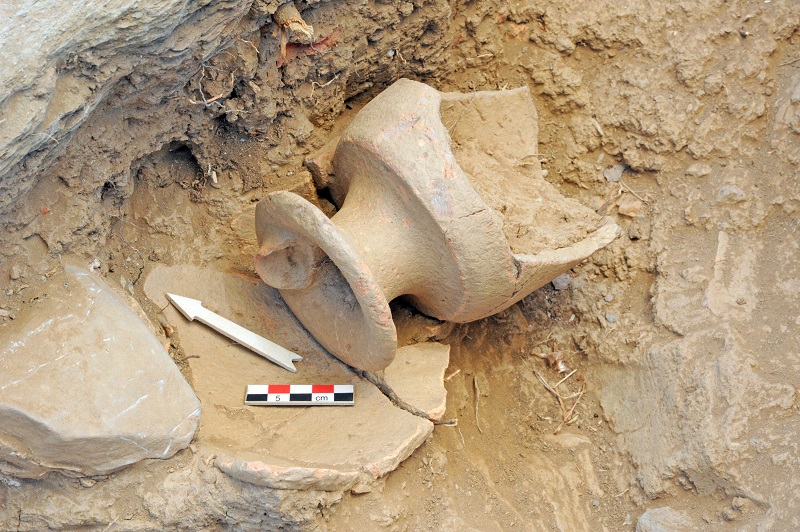 Εξαιρετικά ενδιαφέρουσα ήταν η αποκάλυψη χώρου έξω από την βόρεια πρόσοψη του Κεντρικού Κτηρίου και προσκολλημένου σε αυτό, που έδωσε εκατοντάδες αγγείων, μεταξύ των οποίων ρυτά (τελετουργικά αγγεία) (Φωτ.13-14) και αποτελούσε πιθανώς ΣΚΕΥΟΦΥΛΑΚΕΙΟ. Ο χώρος, λόγω του πλήθους των ευρημάτων δεν εξαντλήθηκε στρωματογραφικά.