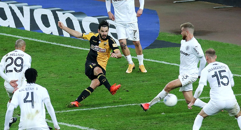 Αν και οι φιλοξενούμενοι προηγήθηκαν στο 6′ με το σουτ του Φάμπιο Στάρτζεον, η ΑΕΚ έκανε την ανατροπή με την κεφαλιά του Ιονούτς Νεντελτσιάρου στο 32′ με και το εκπληκτικό προσωπικό γκολ του COSMOTE MVP Γεβγέν Σάκχοφ με ατομική προσπάθεια και πλασέ στο 74′.