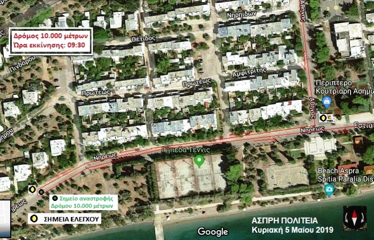 Η Αφετηρία και ο Τερματισμός στην Παραλιακή οδό Άσπρων Σπιτιών Παραλίας Διστόμου, μπροστά από το εντευκτήριο του συλλόγου. Οι αγώνες περιλαμβάνουν διαδρομές εντός του οικισμού Άσπρων Σπιτιών και επί της δημοσίας οδού προς τον Άγιο Νικόλαο όπου βρίσκεται το εργοστάσιο ΑΛΟΥΜΙΝΙΟΝ ΤΗΣ ΕΛΛΑΔΟΣ της ΜΥΤΙΛΗΝΑΙΟΣ Α.Ε.