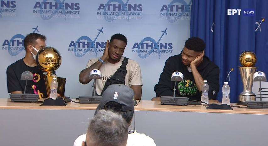Γιάννης: «Κι εγώ θέλω να ευχαριστήσω τον κόσμο για την στήριξη. Είμαστε χαρούμενοι που είμαστε πίσω και βλέπουμε τους φίλους μας και την οικογένειάς μας. Είμαστε χαρούμενοι που φέραμε και το κύπελλο εδώ. Και είμαι επίσης χαρούμενος που φέραμε στην Ελλάδα ένα από τα μεγαλύτερα κύπελλα στον κόσμο. Θα το πάμε στα Σεπόλια, θα το πάμε στου Ζωγράφου. Έχουμε δουλέψει πολύ σκληρά όλοι μας και οι συμπαίκτες μου στο Μιλγουόκι και όλοι στην ομάδα».