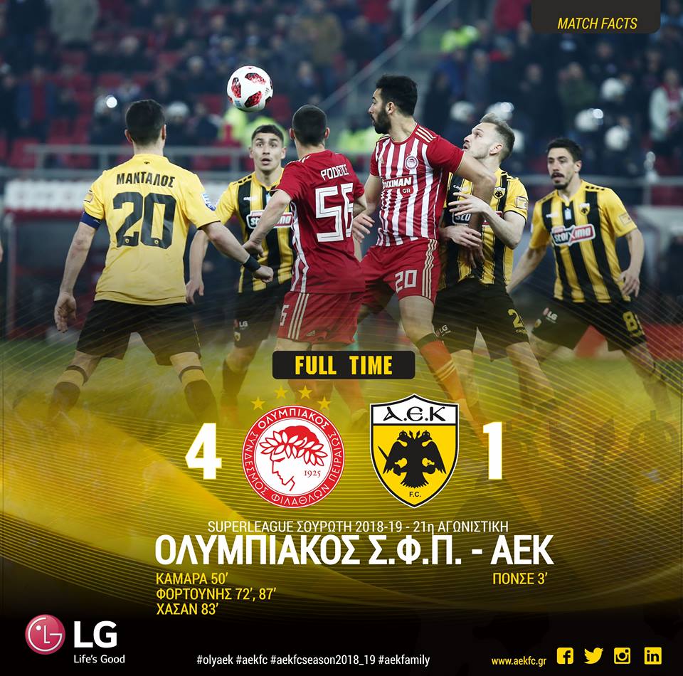 Η ΑΕΚ προηγήθηκε μόλις στο 3ο λεπτό με τον Πόνσε, αλλά οι «ερυθρόλευκοι» απάντησαν με τέσσερα γκολ στην επανάληψη, σκοράροντας με τους Καμαρά (50΄), Φορτούνη (72΄, 87΄) και Χασάν (83΄).