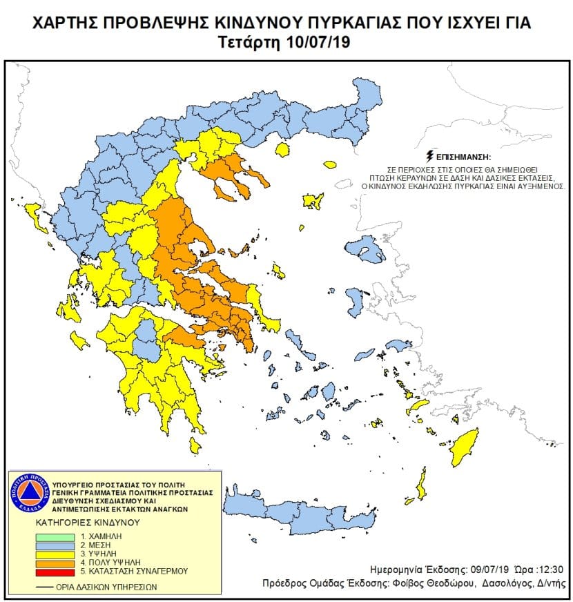 Χάρτης Πρόβλεψης Κινδύνου Πυρκαγιάς για αύριο Τετάρτη 10.07.19 Πολύ Υψηλός Κίνδυνος Πυρκαγιάς για Κορινθία, Αττική, Φθιώτιδα, Βοιωτία, Εύβοια, Λάρισα, Μαγνησία, Σποράδες, ...Ορκίστηκε η νέα κυβέρνηση.Δηλώσεις υπουργών
