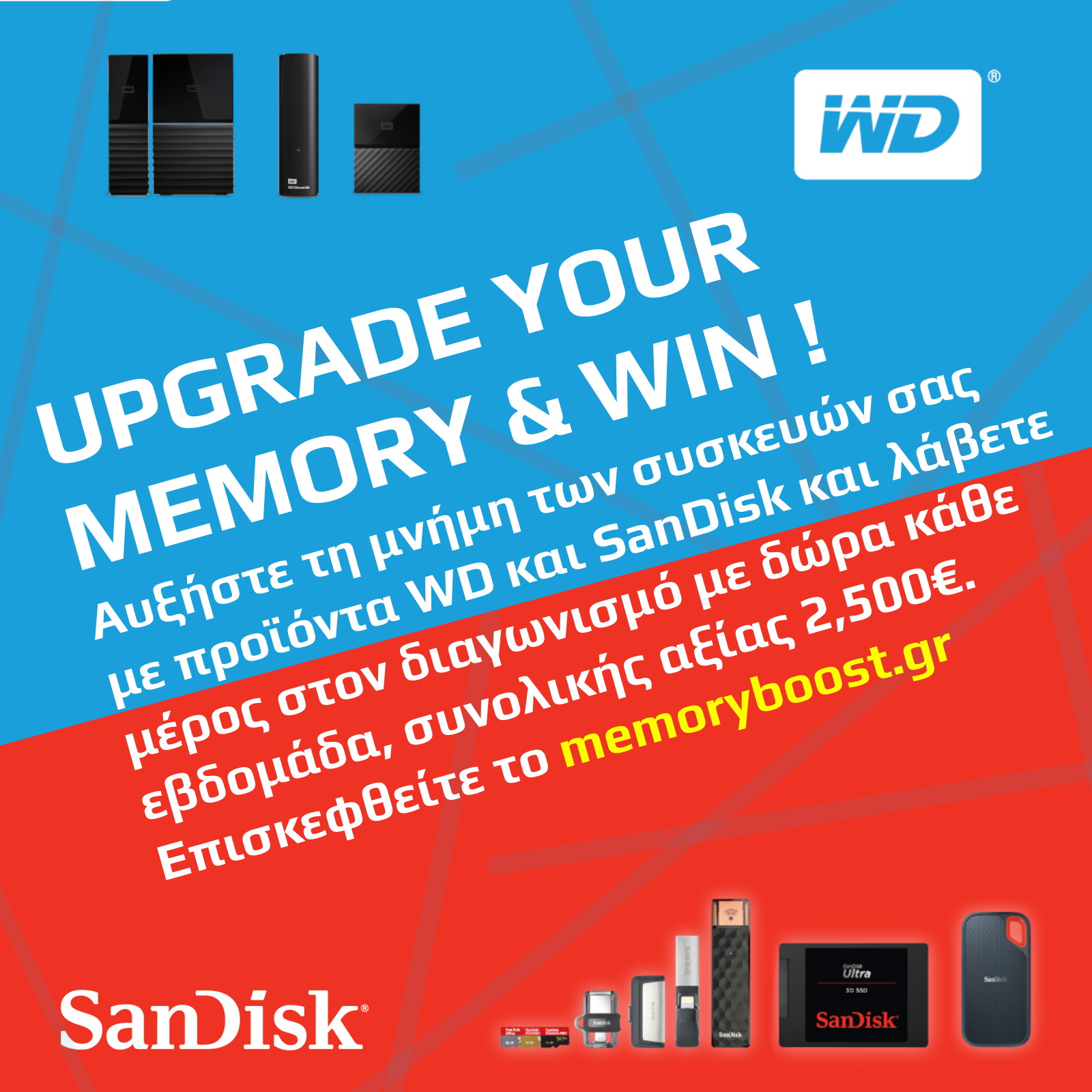 Ο διαγωνισμός MemoryBoost απευθύνεται σε όλους τους κατοίκους Ελλάδας που χρησιμοποιούν προϊόντα SanDisk ή/και WD προκειμένου να επεκτείνουν τη μνήμη των ηλεκτρονικών συσκευών τους και να ομαλοποιήσουν τη ροή εργασίας τους. Ο διαγωνισμός θα βρίσκεται σε ισχύ από την 1η Φεβρουαρίου 2019 έως και την 28η Μαρτίου 2019, παρέχοντας τη δυνατότητα στους καταναλωτές να αναβαθμίσουν τη μνήμη των συσκευών τους με τα προϊόντα SanDisk και WD και να κερδίσουν πλούσια δώρα κάθε εβδομάδα. Τα δώρα περιλαμβάνουν φωτογραφικές μηχανές DSLR, action cameras, συσκευές αποθήκευσης ψηφιακών αρχείων και soundbar με σύνδεση Bluetooth, συνολικής αξίας 2.500€!