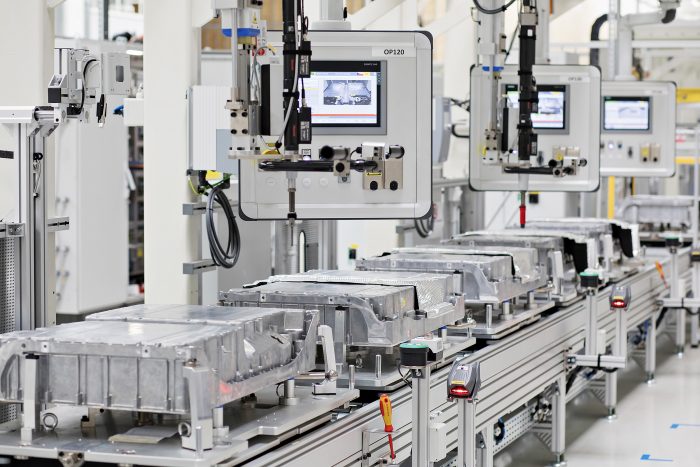 Κάθε βάρδια απασχολεί 58 εργαζόμενους οι οποίοι υποβοηθούνται από συνολικά 13 ρομπότ. Είναι χαρακτηριστικό ότι τα modules για το αριστερό και το δεξί μισό μιας μπαταρίας, τυγχάνουν ξεχωριστής επεξεργασίας. Διατίθενται με μια ειδική θερμοαγώγιμη μεμβράνη, η οποία αποβάλλει τη θερμότητα και βοηθά στην ψύξη του συστήματος. Επιπλέον, ένα ψυκτικό υγρό προστίθεται μεταξύ των δύο modules πριν συνδεθούν σε μία ενιαία μονάδα με περίβλημα αλουμινίου. Η ολοκληρωμένη μπαταρία, εκτός των ηλεκτρονικών διαθέτει επίσης όλες τις απαραίτητες προκαλωδιώσεις, στεγανοποιήσεις και βραχίονες, έτοιμη για τοποθέτηση στο όχημα.