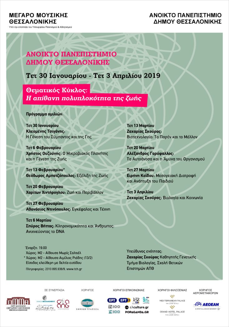 Το Ανοικτό Πανεπιστήμιο του Δήμου Θεσσαλονίκης, ένα από τα πλέον επιτυχημένα προγράμματα διά βίου μάθησης του δήμου, δίνει την ευκαιρία στο κοινό να εμπλουτίσει τις γνώσεις του σε επιμέρους επιστημονικά θέματα, παρακολουθώντας τις εισηγήσεις διακεκριμένων μελών της ακαδημαϊκής κοινότητας, πανεπιστημιακών δασκάλων και ειδικών ερευνητών. Η θεματική ενότητα που παρουσιάζεται στο Μέγαρο Μουσικής Θεσσαλονίκης από τις 30 Ιανουαρίου 2019 και κάθε Τετάρτη έως τις 3 Απριλίου 2019 έχει τίτλο «Η απίθανη πολυπλοκότητα της ζωής».