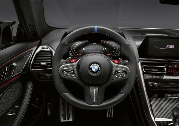 Για πλήρη αξιοποίηση των προσόντων των νέων BMW M8 σε επίπεδο δυναμικής συμπεριφοράς, ζωτικός παράγοντας είναι το τιμόνι M Performance Pro με ανθρακονημάτινα shift paddles και ένθετο από ανθρακόνημα /Alcantara – ανθρακόνημα /δέρμα. Χάρη στις ευδιάκριτες περιοχές λαβής σε επένδυση Alcantara, με μεγάλες υποδοχές για τους αντίχειρες και ειδική εσωτερική επένδυση, εγγυάται τέλεια λαβή και άμεση αίσθηση κατευθυντικότητας. Με σύμβολα αλλαγών σε τολμηρό κόκκινο χρώμα, τα shift paddles από ανθρακονήματα – διατίθενται και ανεξάρτητα για το στάνταρ τιμόνι – παραπέμπουν στο μηχανοκίνητο αθλητισμό, όπως και η μπλε κεντρική σήμανση στο τιμόνι M Performance Pro και η ραφή του σε χρώματα M – μπλε, κόκκινο και βιολετί. Η ανανεωμένη αγωνιστική ατμόσφαιρα ολοκληρώνεται τέλεια με αντιολισθητικά, σταθερά πατάκια M Performance από βελούδο, με δερμάτινη μπορντούρα, λογότυπο M Performance και σημαιάκι σε κλασικά χρώματα M.