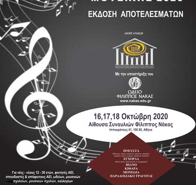 Ο Όμιλος για την UNESCO Τεχνών, Λόγου και Επιστημών Ελλάδος, πραγματοποίησε τον 5ο Πανελλήνιο Διαγωνισμό Μουσικής, για το έτος 2020, με την υποστήριξη του Ωδείου Φίλιππος Νάκας, στην Αίθουσα Συναυλιών του Ωδείου στις 16, 17 και 18 Οκτωβρίου 2020.