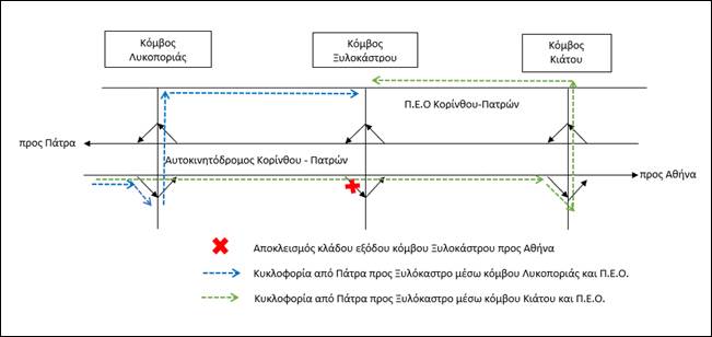 Η κυκλοφορία για το διάστημα αυτό θα εξυπηρετείται μέσω της Π.Ε.Ο. Κορίνθου-Πατρών και των όμορων Κόμβων Λυκοποριάς (Χ.Θ. 131,9) ή/και Κιάτου (Χ.Θ. 105,7) όπως φαίνεται στο ακόλουθο σχηματικό διάγραμμα.