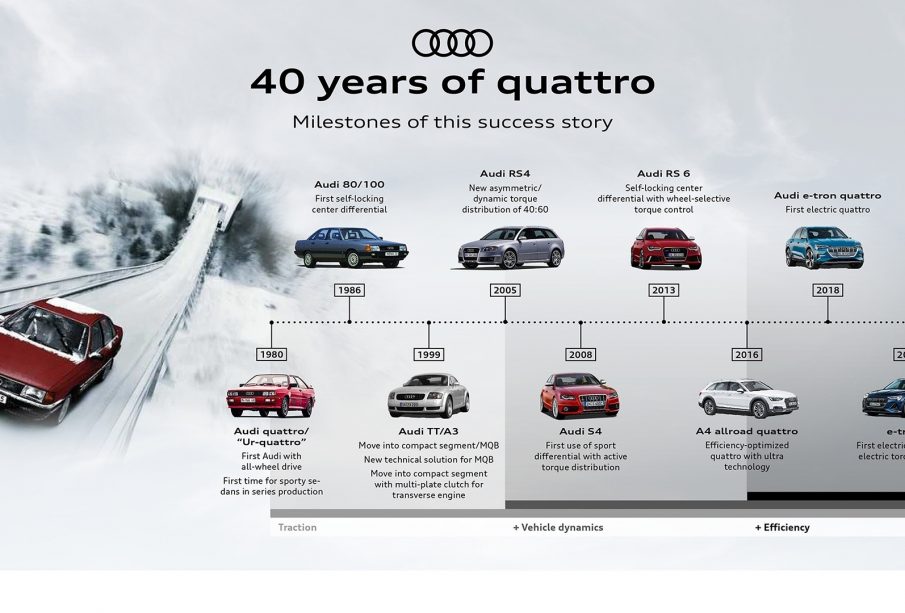 Το κινητήριο σύστημα quattro, η πιο διάσημη τετρακίνηση στην αυτοκινητοβιομηχανία, αποτελεί τον τεχνολογικό πυρήνα της Audi εδώ και 40 χρόνια. Η ιστορία επιτυχίας του quattro κυμαίνεται από τα χειροκίνητα μπλοκέ διαφορικά του 1980 έως τους τρεις ηλεκτρικούς κινητήρες των νέων μοντέλων S στη γκάμα e–tron της Audi. Τέσσερα δακτυλίδια, τέσσερις κινητήριοι τροχοί, τέσσερις δεκαετίες επιτυχιών μέσα από 40 αριθμούς, μια μικρή συλλογή γεγονότων που εκφράζουν παραστατικά την ιστορία του quattro.