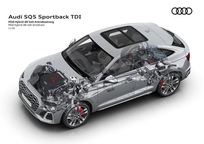 Η καρδιά του Audi SQ5 Sportback TDI είναι ένας επανασχεδιασμένος τρίλιτρος πετρελαιοκινητήρας με ισχύ 341 PS (251 kW) και ροπή 700 Nm, στην περιοχή 1.750 – 3.250 σ.α.λ.. Ο 3.0 V6 TDI έχει δεχθεί πολλές μηχανολογικές επεμβάσεις, διαθέτει ατσάλινα έμβολα και καλύτερη θερμική απόδοση ενώ και ο ψεκασμός γίνεται πιο γρήγορα και με μεγαλύτερη ακρίβεια.