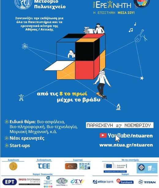 Το Εθνικό Μετσόβιο Πολυτεχνείο, συνεπές στο ραντεβού του για έβδομη συνεχή χρονιά, διοργανώνει στο εμβληματικό κτήριο Αβέρωφ τη Βραδιά του Ερευνητή την Παρασκευή 27 Νοεμβρίου 2020, μέσω live streaming. Η Εναρκτήρια τηλε-Εκδήλωση (8:15-9:15 το πρωί) καθώς και όλο το μαγνητοσκοπημένο υλικό των 200 video των συμμετοχών των Ερευνητικών Ομάδων του Εθνικού Μετσόβιου Πολυτεχνείου, των Πανεπιστημίων της Αθήνας, Ερευνητικών Κέντρων, σχολείων, των συνεργαζόμενων φορέων και χορηγών, θα μεταδίδεται από το κανάλι της Βραδιάς του Ερευνητή στο ΕΜΠ www.youtube.com/ntuaren από τις 8:15 το πρωί μέχρι 20:15 το βράδυ. Με τη λήξη της ζωντανής ροής όλο το υλικό θα είναι διαθέσιμο τόσο στο κανάλι www.youtube.com/ntuaren όσο και στην ιστοσελίδα www.ntua.gr/ntuaren. Ειδικά η Εναρκτήρια τηλε-Εκδήλωση θα μεταδίδεται ζωντανά και από το site της ΕΡΤ την Παρασκευή 27 Νοεμβρίου και ώρα 8:15-9:15, ενώ θα προβληθούν και αντιπροσωπευτικά video.