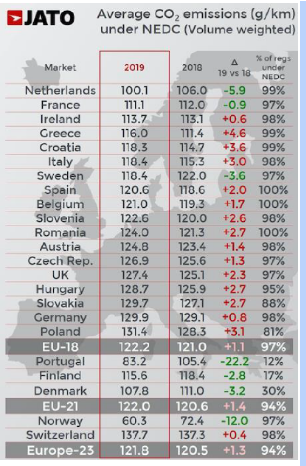 Το περασμένο έτος, ο σταθμισμένος μέσος όρος εκπομπών CO2 για τις ευρωπαϊκές αγορές ήταν στα επίπεδα που καταγράφονταν από το 2014. Σύμφωνα με τα στοιχεία από τη JATO Dynamics, ο μέσος όρος για τις 23 ευρωπαϊκές αγορές έφτανε τα 121.8 g/km σύμφωνα με το πρότυπο NEDC – την τρίτη συνεχόμενη τέτοια ετήσια αύξηση. Ο Felipe Munoz, παγκόσμιος αναλυτής της JATO Dynamics διευκρίνισε: “Όπως ήταν αναμενόμενο, ο συνδυασμός λιγότερων ταξινομήσεων ντίζελ και περισσότερων SUV συνέχισε να επηρεάζει τις εκπομπές. Δεν αναμένουμε να αλλάξει αυτή η τάση μεσοπρόθεσμα, στην πραγματικότητα αυτά τα αποτελέσματα υπογραμμίζουν περαιτέρω την ανάγκη της βιομηχανίας να υιοθετήσει τα EVs με ταχύ ρυθμό για να επιτύχει τους στόχους εκπομπών ρύπων.”